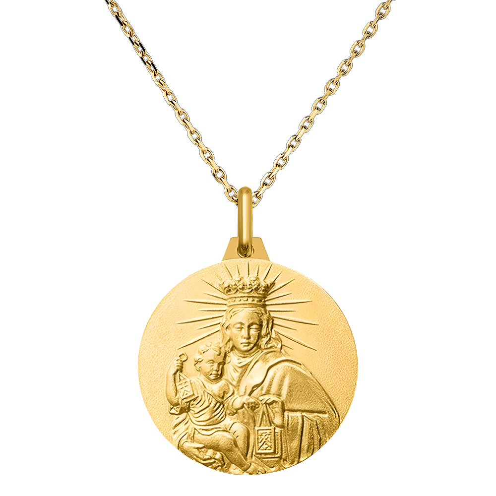 Deze dubbelzijdige medaille van geelgoud combineert twee krachtige symbolen van het christelijk geloof: het Heilig Hart van Jezus en de Maagd Maria met het Kind Jezus. Aan de ene kant het Heilig Hart van Jezus, symbool van goddelijke liefde en toewijding, en aan de andere kant de Maagd Maria, moederlijk en beschermend, met het Kind Jezus. Dit sieraad is een waar getuigenis van geloof, bescherming en goddelijk licht, perfect voor belangrijke spirituele gelegenheden zoals een doop, een communie of elk heilig moment.