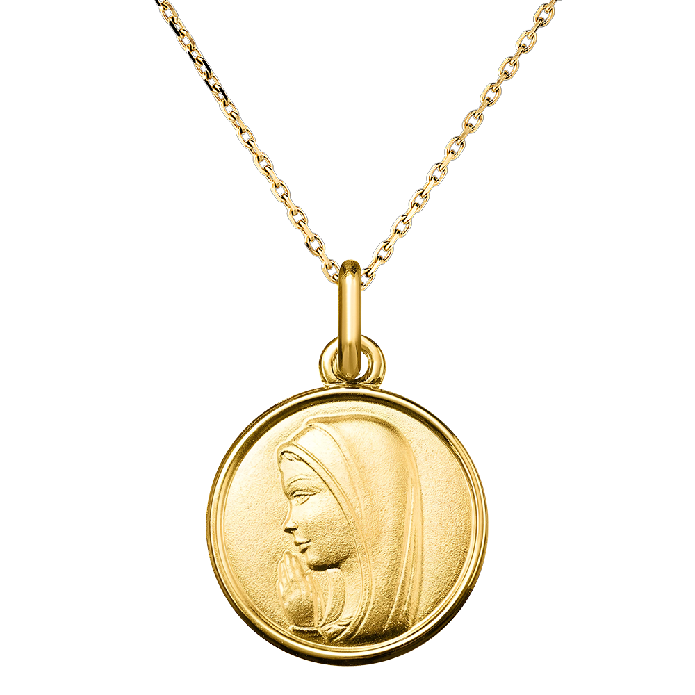 Deze medaille van geel goud toont de Maagd Maria in een biddende houding, met samengevouwen handen en een uitdrukking van sereniteit en devotie. Het eenvoudige maar elegante ontwerp legt de nadruk op de zachtheid en puurheid van het beeld, met een delicaat reliëf dat de goddelijke gratie van Maria benadrukt. Dit sieraad is een symbool van geloof, bescherming en innerlijke vrede, perfect voor spirituele gelegenheden zoals een doop, een communie of een ander heilig moment.