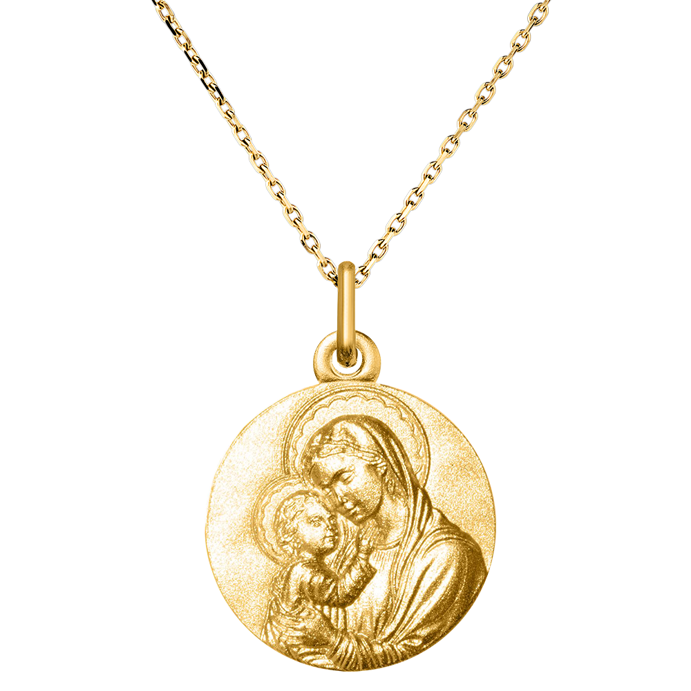 Deze geelgouden medaille vangt een teder moment, met de heilige omhelzing tussen de Maagd Maria en het Kind Jezus. Het verfijnde ontwerp, met de delicate trekken en gebaren, weerspiegelt de moederlijke liefde en goddelijke bescherming. Perfect voor het vieren van een spirituele gelegenheid zoals een doop, communie of elk heilig evenement.