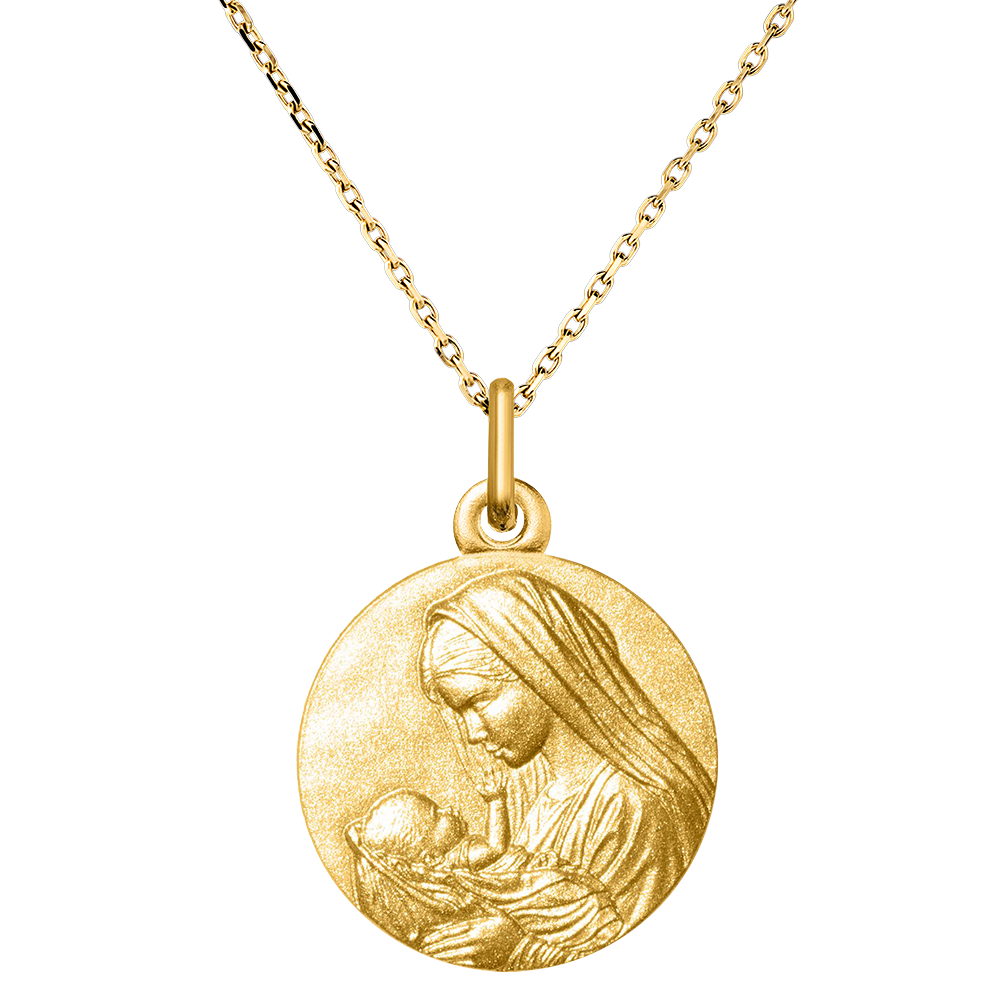 Deze geelgouden medaille toont de tedere zorg van de Maagd Maria die het kindje Jezus in haar armen houdt. Hun gezichten zijn fijn gebeeldhouwd in een subtiel reliëf, wat de zachtheid van dit heilige moment van intimiteit benadrukt. De Maagd Maria, kalm en beschermend, houdt haar kind met oneindige tederheid vast, terwijl het kindje Jezus vredig in haar armen rust. Deze medaille, die de moederliefde en goddelijke bescherming symboliseert, is een tijdloos cadeau voor het markeren van heilige gelegenheden zoals een doop of geboorte.