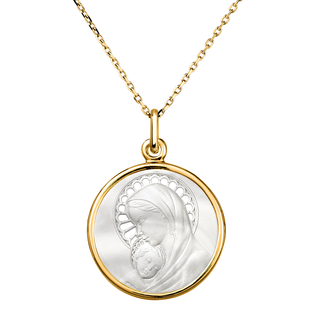Deze medaille, gemaakt van geelgoud en parelmoer, beeldt de Maagd Maria uit die het Kind Jezus teder vasthoudt. De delicate iconografie wordt versterkt door een opengewerkte parelmoer aura, die lichtheid en een vleugje elegantie toevoegt. Dit sieraad, symbool van puurheid en zachtheid, is perfect voor het eren van een spirituele gelegenheid zoals een doop of communie.