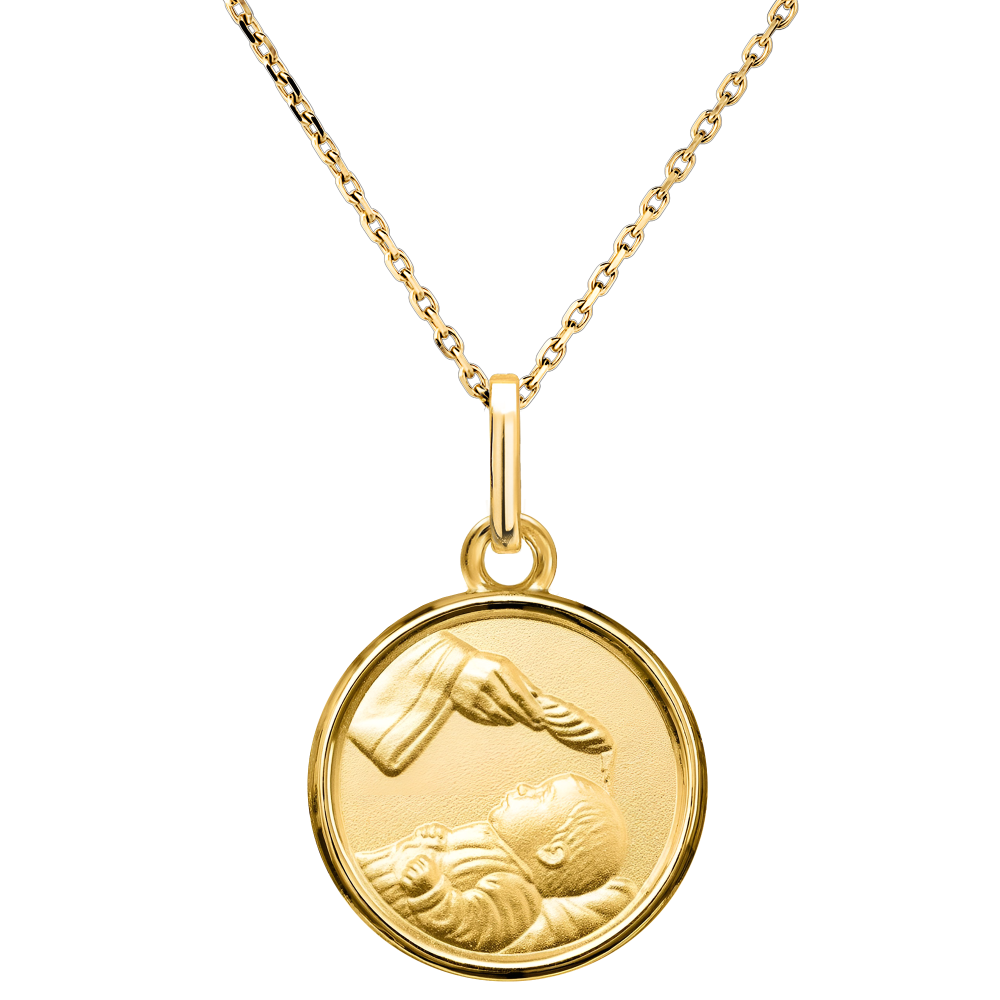 Deze geelgouden medaille beeldt een heilig moment uit: de doop van een kind, gesymboliseerd door een hand die wijwater giet. Een betekenisvol sieraad dat zuiverheid en het begin van een spirituele reis vastlegt, ideaal om deze overgangsrite te herdenken.