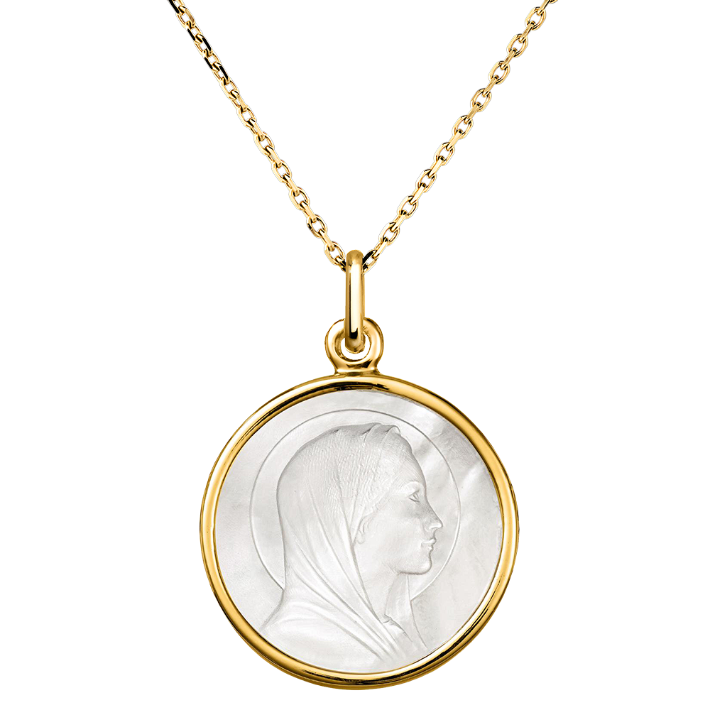 Deze medaille, vervaardigd in geelgoud en parelmoer, toont een profiel van de Maagd Maria, zorgvuldig gesculpt om sereniteit en zachtheid uit te stralen. Het parelmoer voegt een zachte glans toe, terwijl het geelgoud de eenvoudige elegantie benadrukt. Dit sieraad, symbool van bescherming en geloof, is perfect voor het markeren van een doop, communie of andere spirituele gelegenheid, een herinnering aan de goddelijke goedheid van de Maagd Maria.
