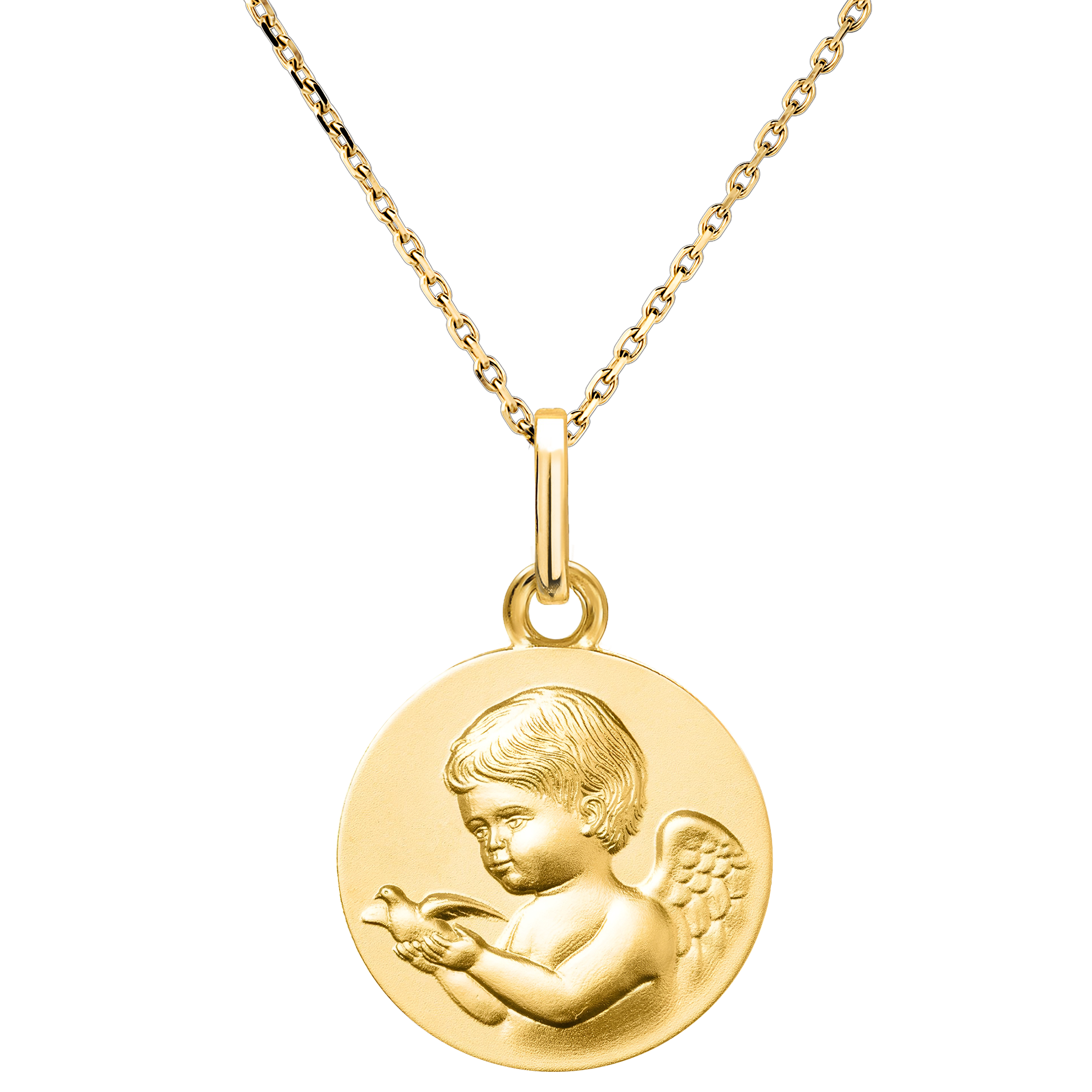 Dit medaillon, met een zachte engel die een duif vasthoudt, symboliseert vrede, onschuld en hemelse welwillendheid.