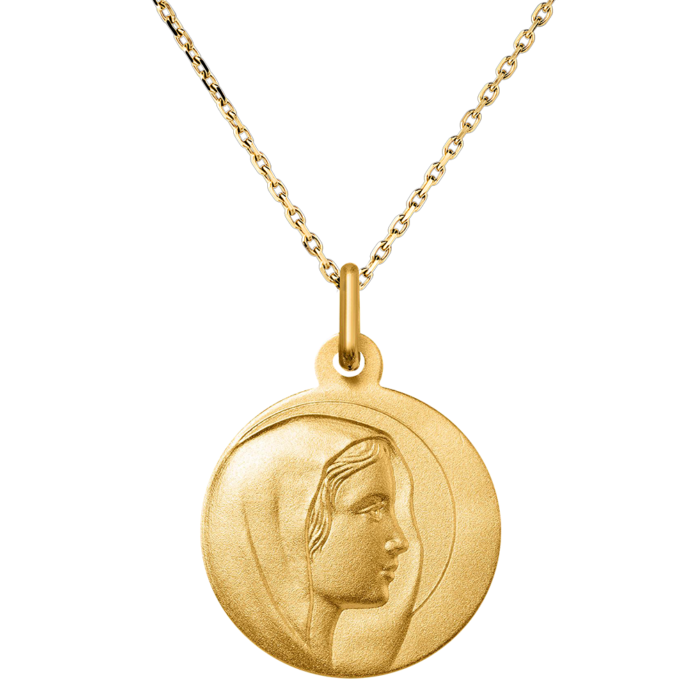 Dit geelgouden medaillon toont een delicaat profiel van de Maagd Maria, gehuld in goddelijk licht. Het eenvoudige, verfijnde ontwerp met subtiele aureool roept zuiverheid en sereniteit op. Dit sieraad symboliseert moederlijke bescherming en spirituele zegen, als een kostbare herinnering aan geloof en devotie. Ideaal om een spirituele gelegenheid zoals een doop of communie te markeren.