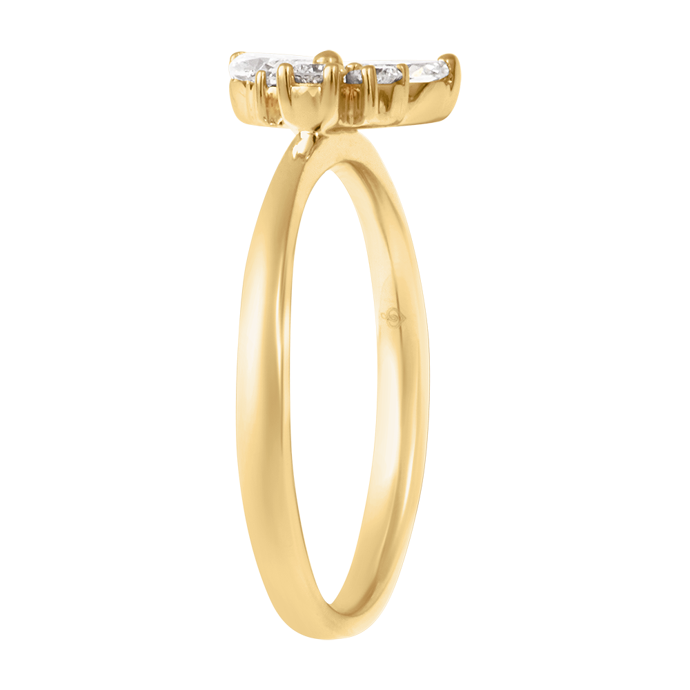 De "Middernacht Vlinder" ring van 9K geelgoud is versierd met vijf synthetische diamanten in marquise- en ronde slijpvormen, samen 0,585 karaat, die een fijn vlindermotief vormen.