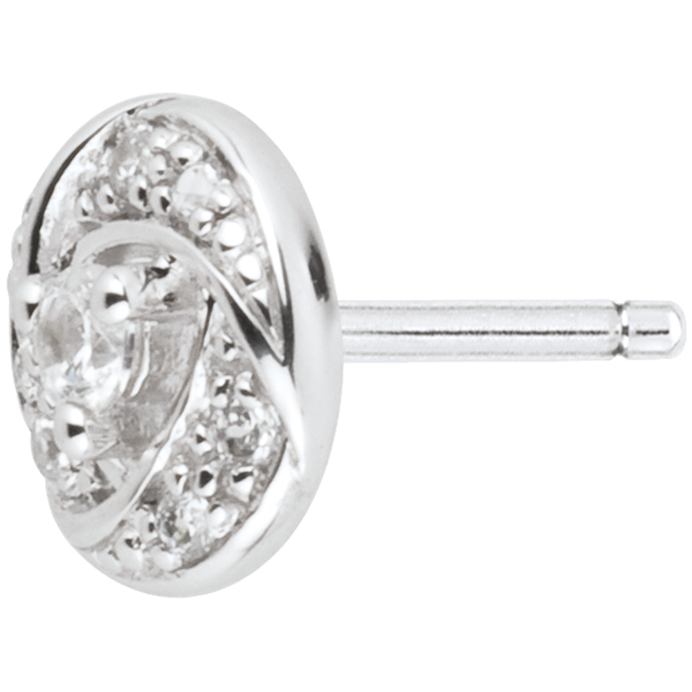 Een solitairee diamant gekruld in witgouden studs ingelegd met briljanten.