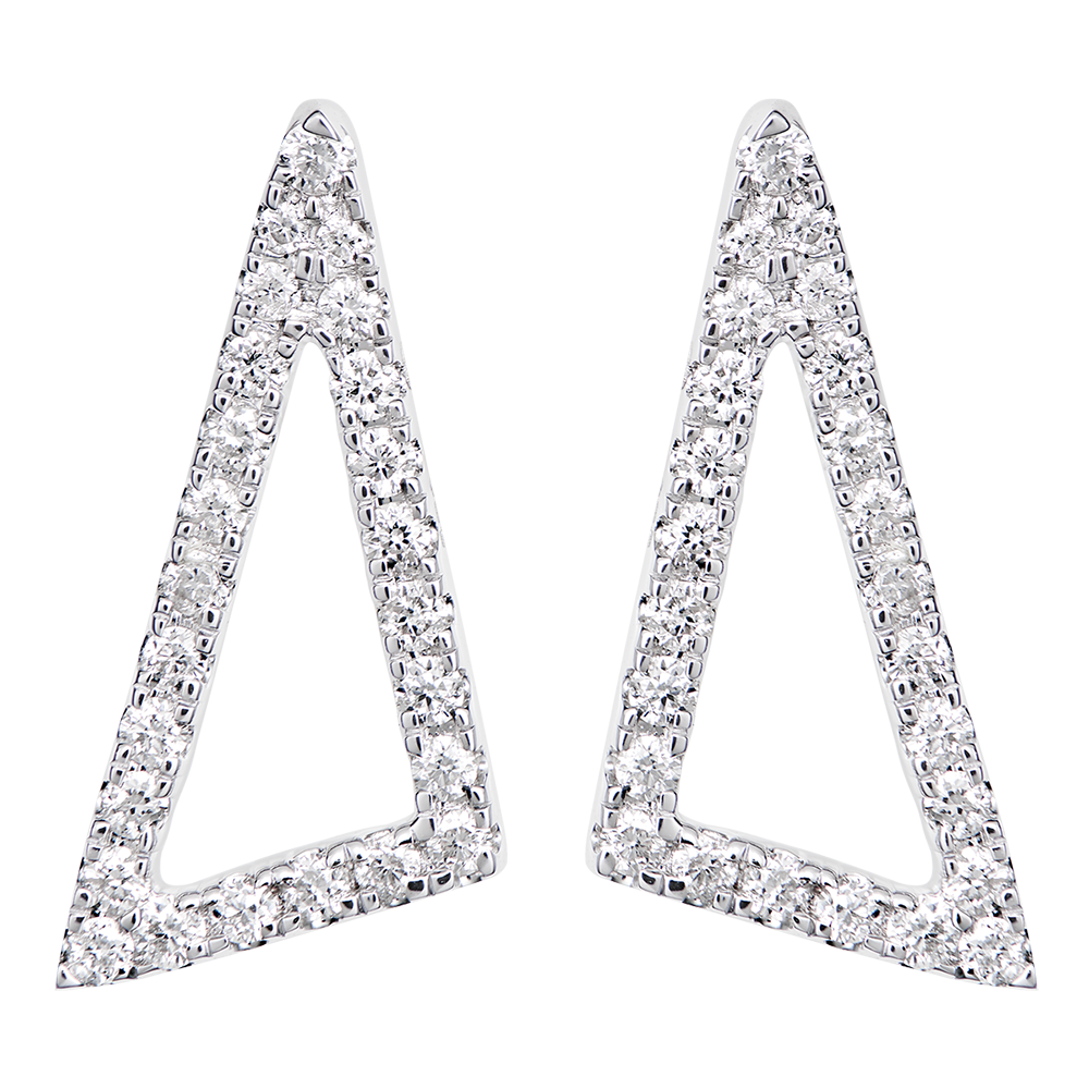 Een paar evenwichtige, met diamanten bezette oorbellen met een grafisch model die tegen de oorlel of hangend gedragen kunnen worden