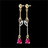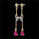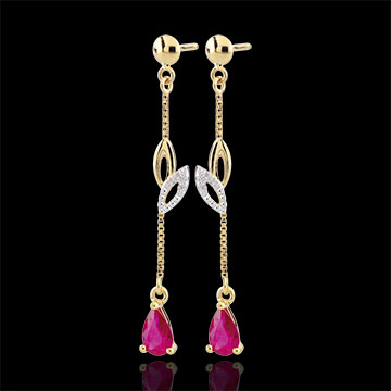 Een paar sierlijke oorbellen in geelgoud met robijnen.