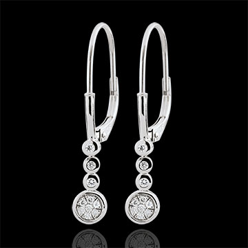 Een trilogie van diamanten dalen verticaal om een constellatie van diamanten tot een laatste punt van elegantie te ondersteunen.