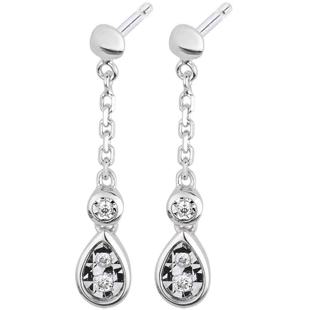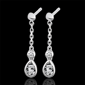 Een bal en witgouden druppel aan het einde van een kleine ketting en dragen elk een diamant in hun hart.