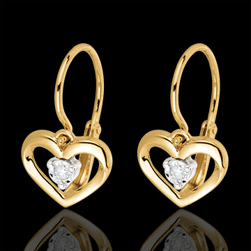 Een diamant genesteld in een fijn hartje, voor elk van haar oorbellen in geelgoud.