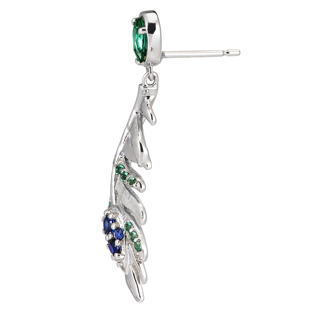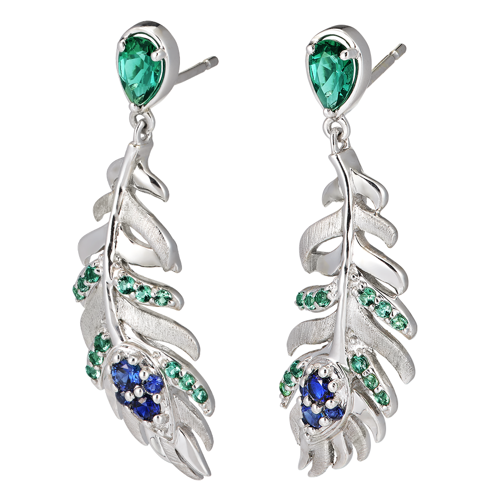 De Infante oorringen in 9 karaats witgoud zijn elegant geïnspireerd door zwevende veren, het embleem van de Panache collectie. Versierd met 4 synthetische saffieren en 30 synthetische smaragden, waaronder 2 peervormige stenen van 0,25 karaat, vangt dit juweel bij elke beweging het licht en geeft het uw outfit een luchtige elegantie en een spectaculaire schittering.