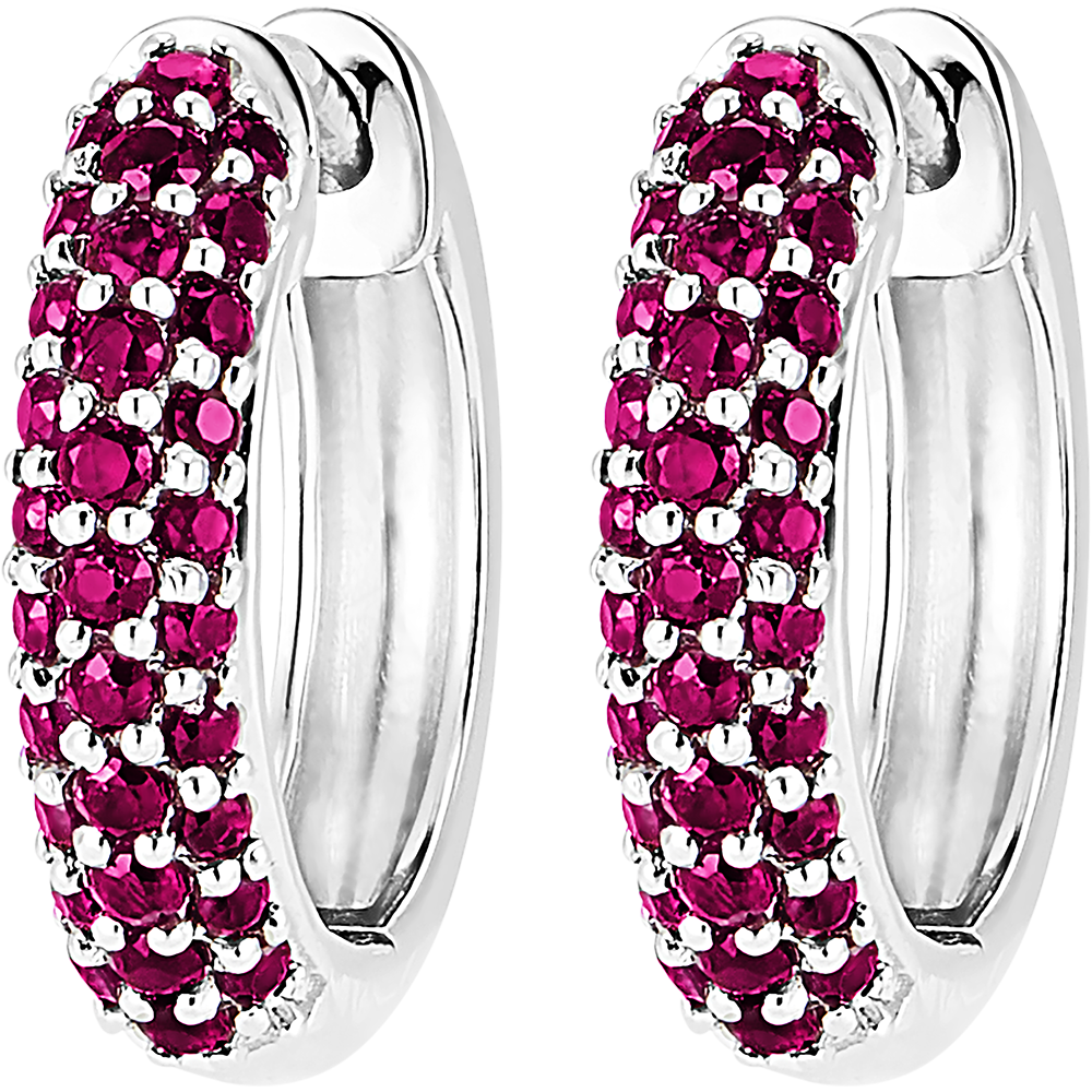 Een paar witgouden creolen bezet met 62 delicate robijnen in drie rijen. Een klassiek maar tijdloos juweel met een kleurrijke touch.