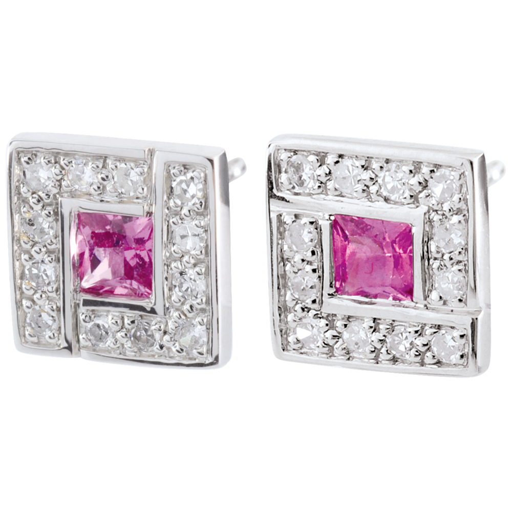 Ze bevatten twee princess geslepen roze saffieren met een totaal van 0,4 karaat, omringd door 24 diamanten van 0,14 karaat.