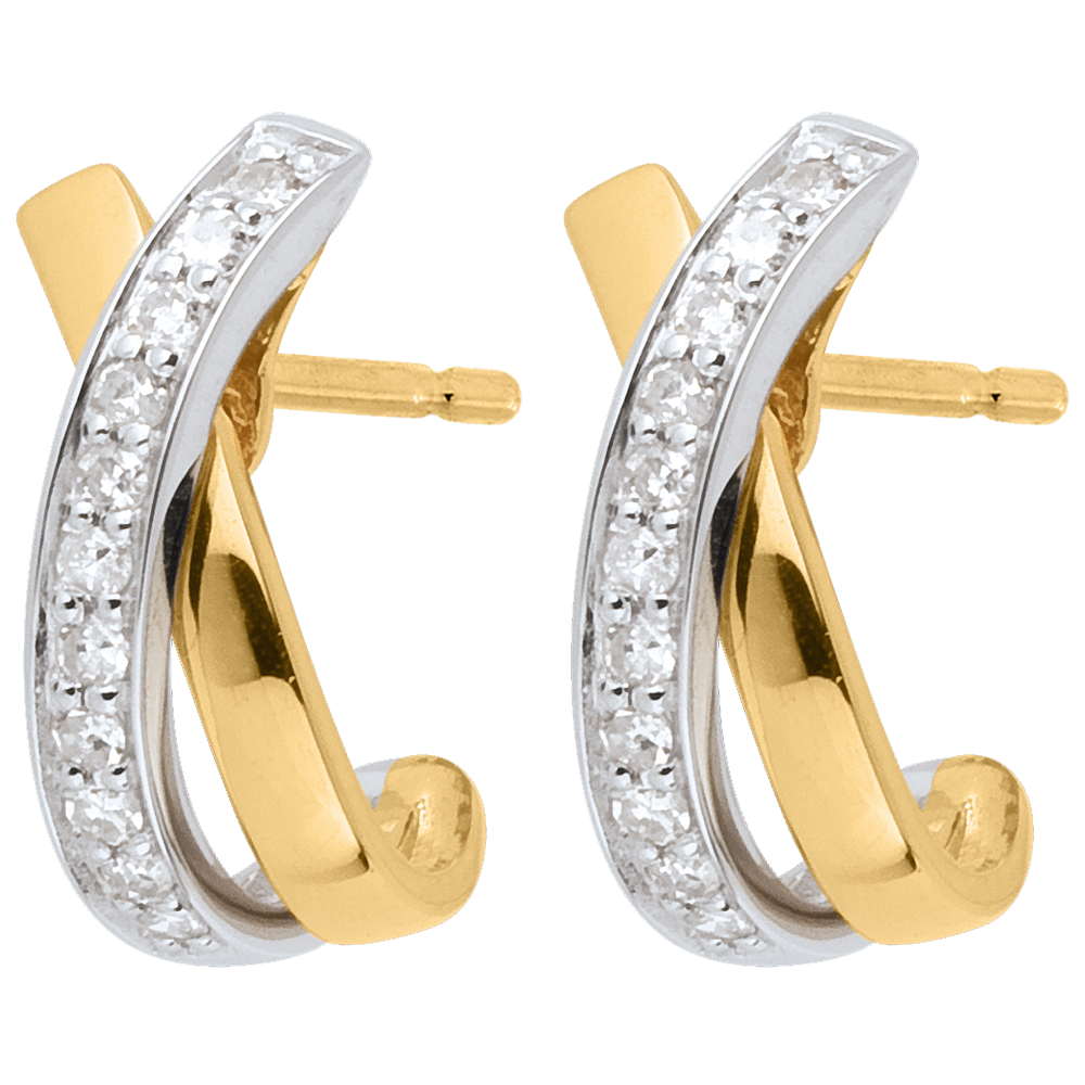 Een tandem halve manen in geel en witgoud geplaveid met diamanten voor een rond en verfijnd paar.