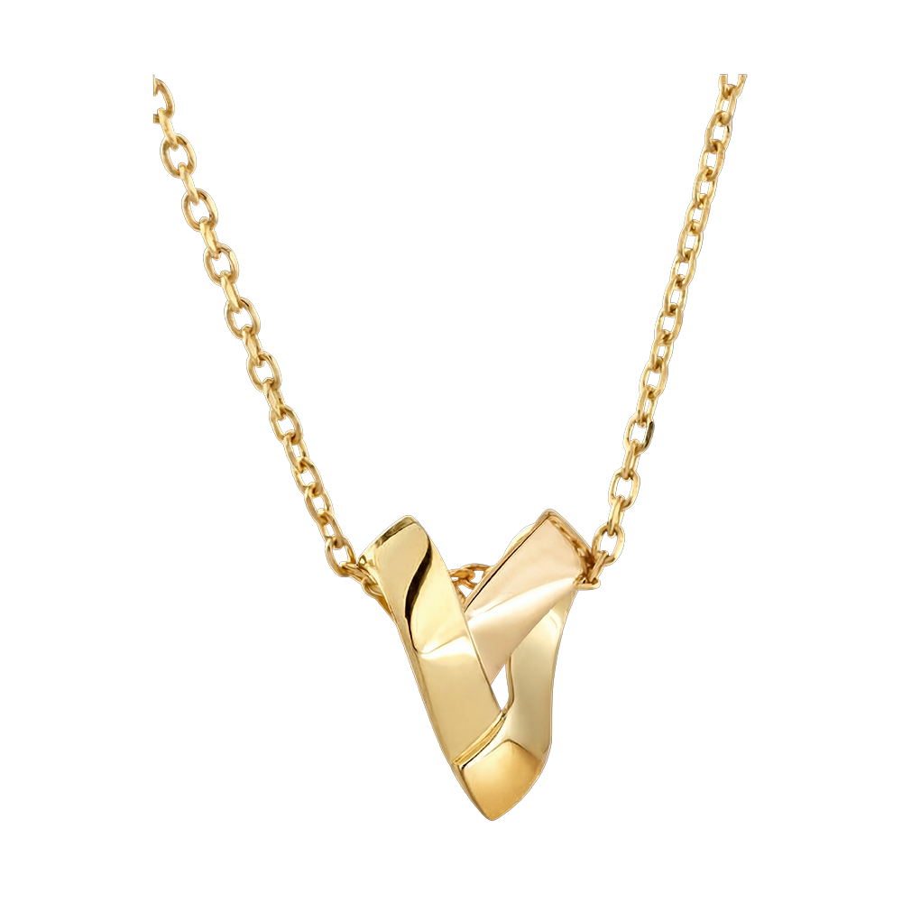 Een hartvormige hanger, gevouwen uit een fijne strook goud en sierlijk bewegend aan een subtiele ketting.