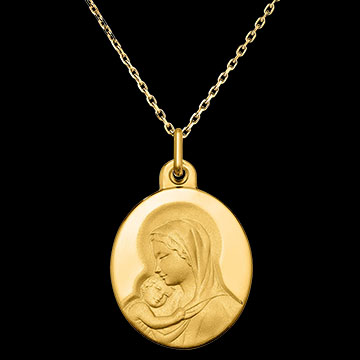 Deze geelgouden medaille vangt de tederheid van het moment waarop de Maagd Maria liefdevol het Kind Jezus in haar armen houdt. De eenvoud van deze scène roept onbegrensde liefde en moederlijke goedheid op. Het subtiele reliëf en de verfijnde afwerking eren een heilige band, die van het moederschap en de goddelijke bescherming. Dit juweel nodigt uit tot sereniteit en reflectie, ideaal om een spiritueel belangrijke gelegenheid te herdenken, zoals een doop of communie.