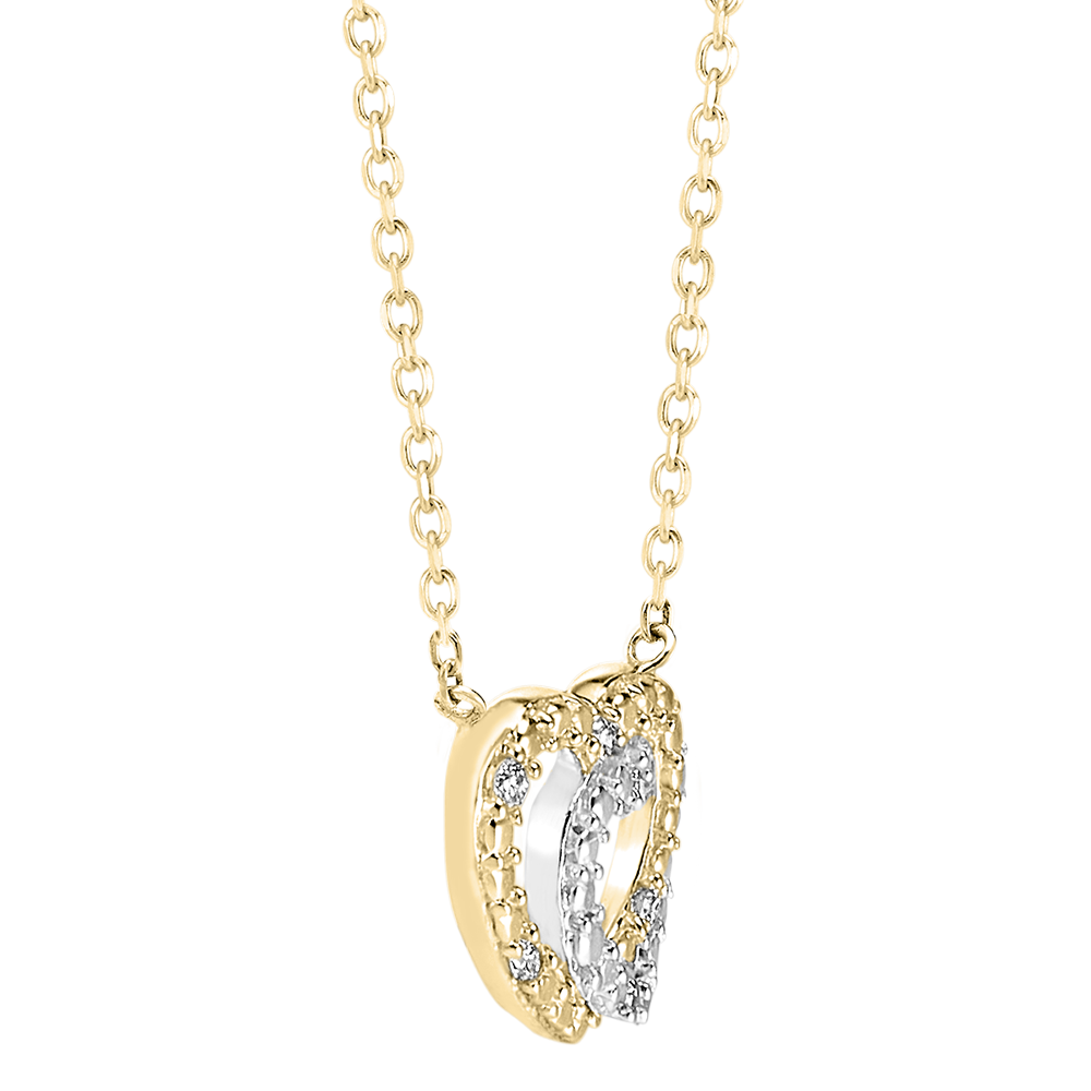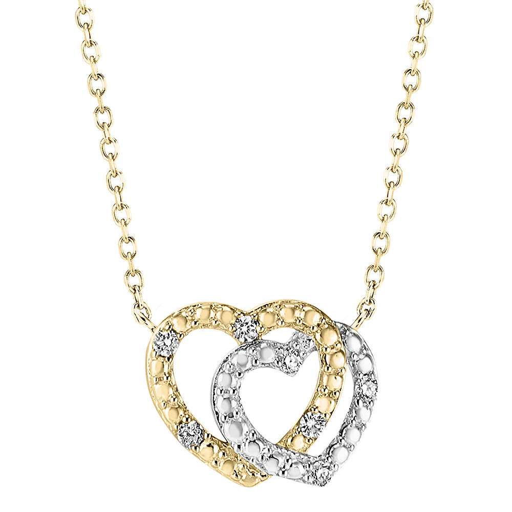 Dit halssnoer duo van harten in wit goud en geel goud bewerkt als een diamant en ingelegd met diamanten inspireert tot tederheid en medeplichtigheid.
