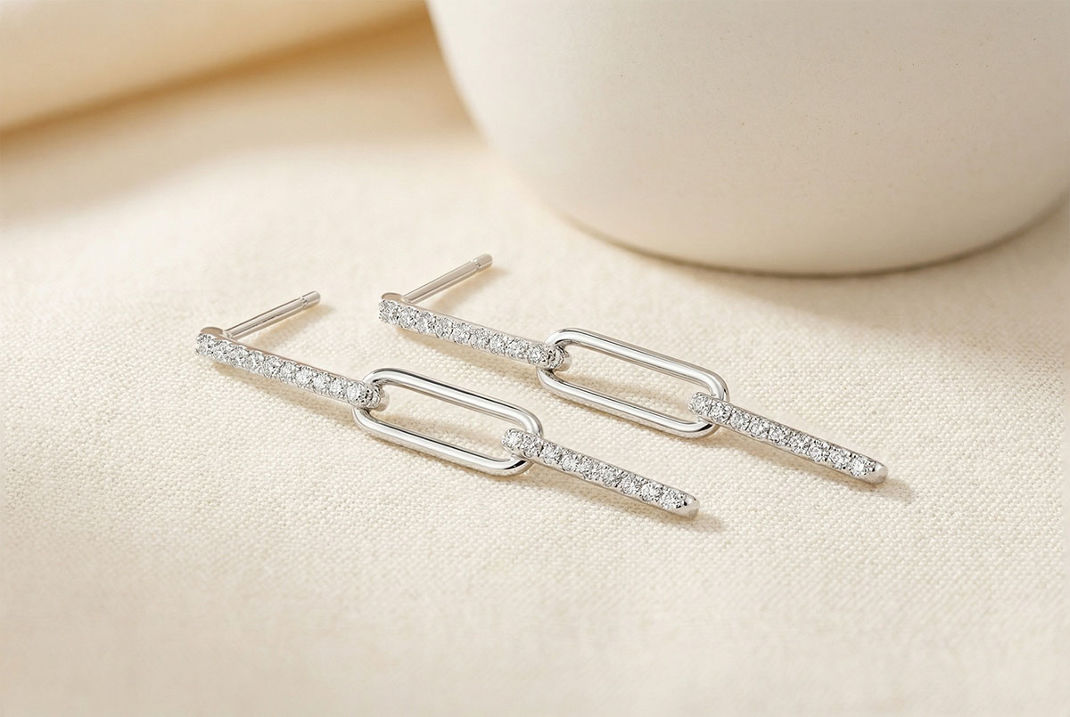 Een trio delicaat met diamanten bezette witgouden schakels slingert elegant. Een paar moderne en vrouwelijke bungelende oorbellen.