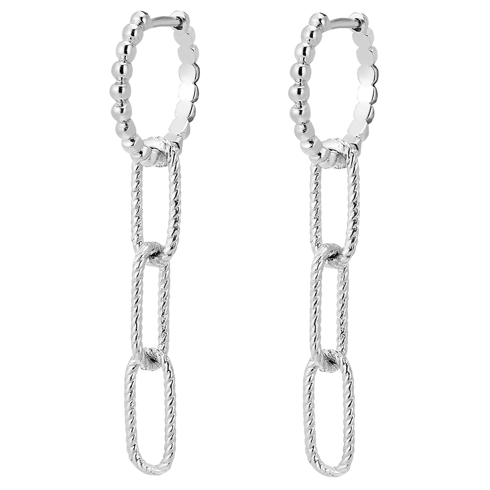 Een trio van fijn gedraaide witgouden schakels bengelen aan een parelgouden hoepel. Een paar moderne en licht wiegende bungelende oorbellen.