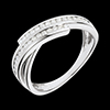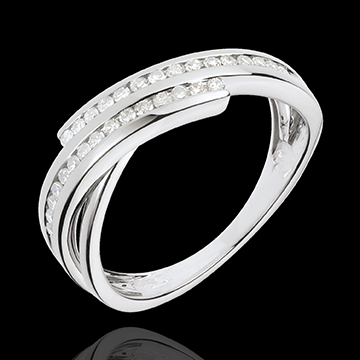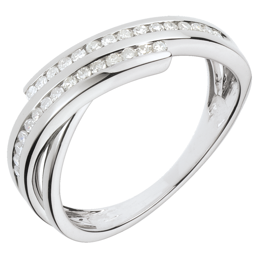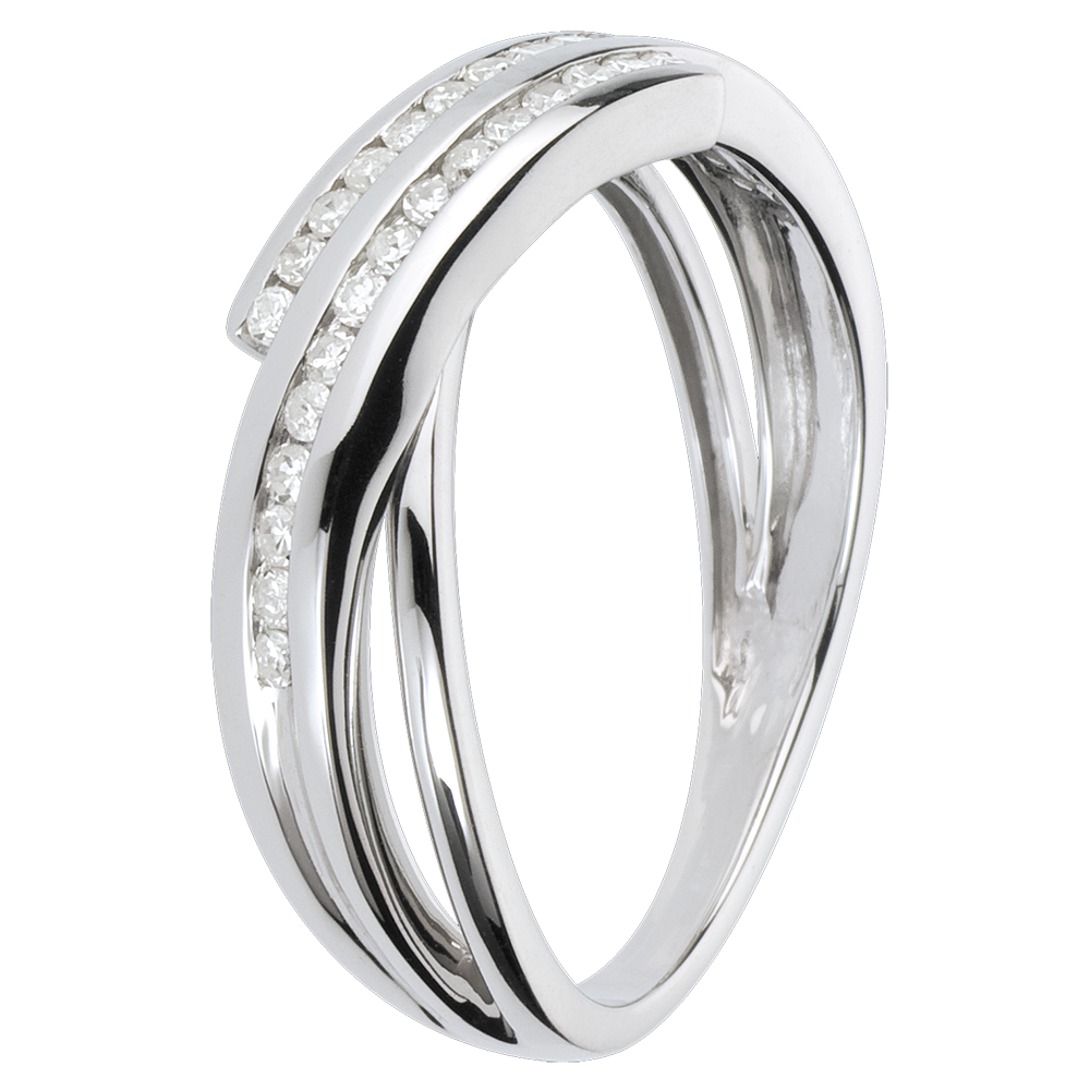 Twee rijen van diamanten komen samen in een beweging op witgoud.