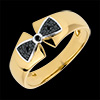 Een geelgouden lint wordt afgesloten door een witgouden knoop, zwart rhodium en zwarte diamanten die je vinger mooi omringen.