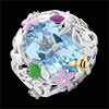 Weelderig loof bewoond door insecten en vruchten en versierd met een blauwe topaas. Edelstenen, diamanten en lak met de hand aangebracht.