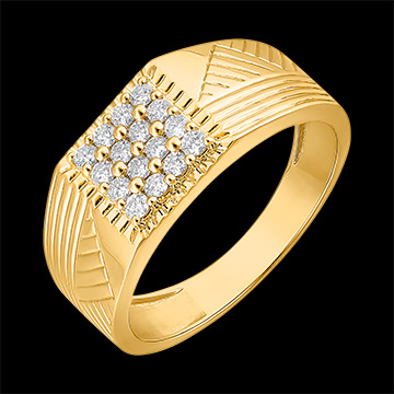 Een zegelring met een subtiel gegraveerde geelgouden basis waarvan het midden royaal is bezet met 16 diamanten.