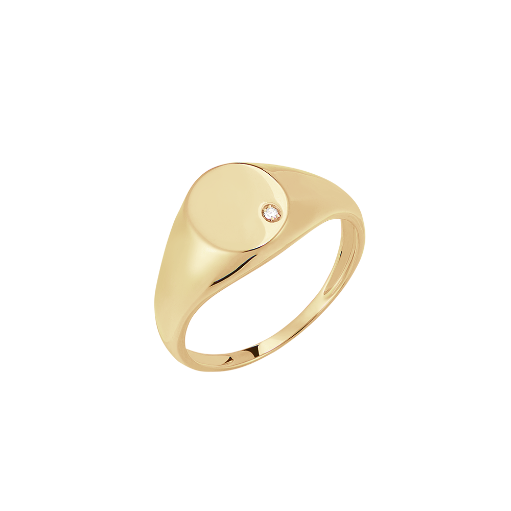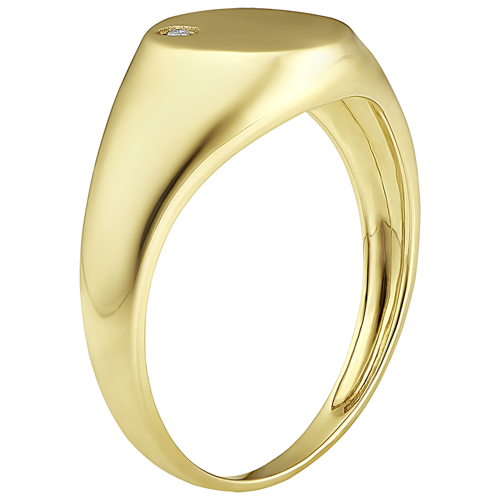 Een geelgouden zegelring waarvan de ovale plaat is bezet met een schitterende diamant. Een resoluut modern juweel.