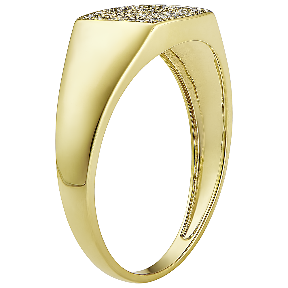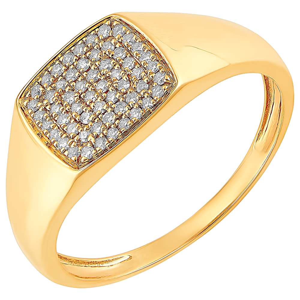 Een geelgouden zegelring waarvan de ronde plaat royaal is bezet met 56 diamanten.