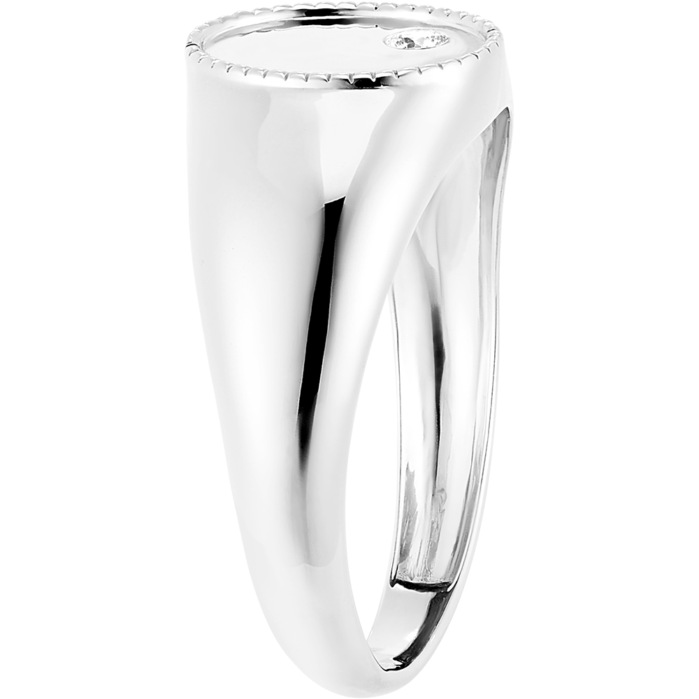 Een sprankelende witte diamant van 0,02 ct en kwaliteit H SI is gezet in de fijn bewerkte rand, wat een subtiele glans geeft.