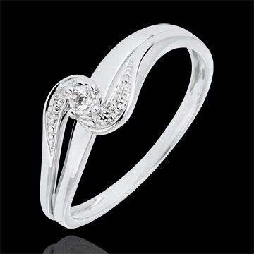 Een diamant op een witgouden vloeiende beweging wordt hartstochtelijk omarmd en ondersteund door een dubbele gouden ring. De centrale diamant is 0.013 karaat