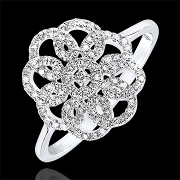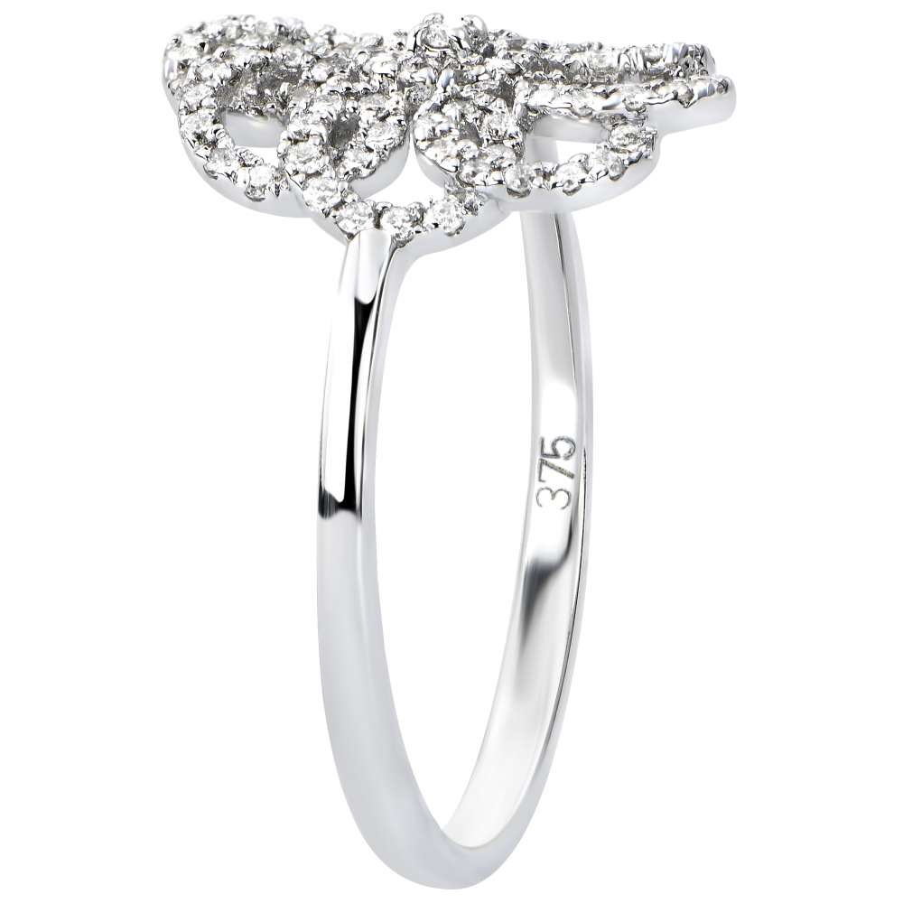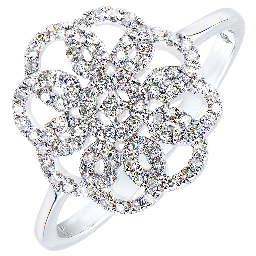 Een ring met caleidoscopische pavézetting, en gekunstelde bogen voor een creatieve en verfijnde ring.