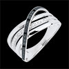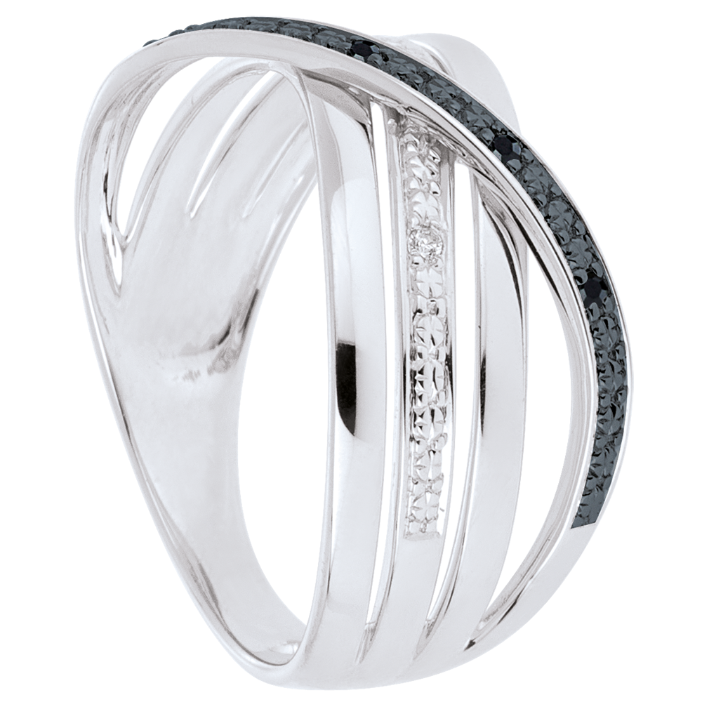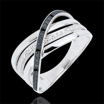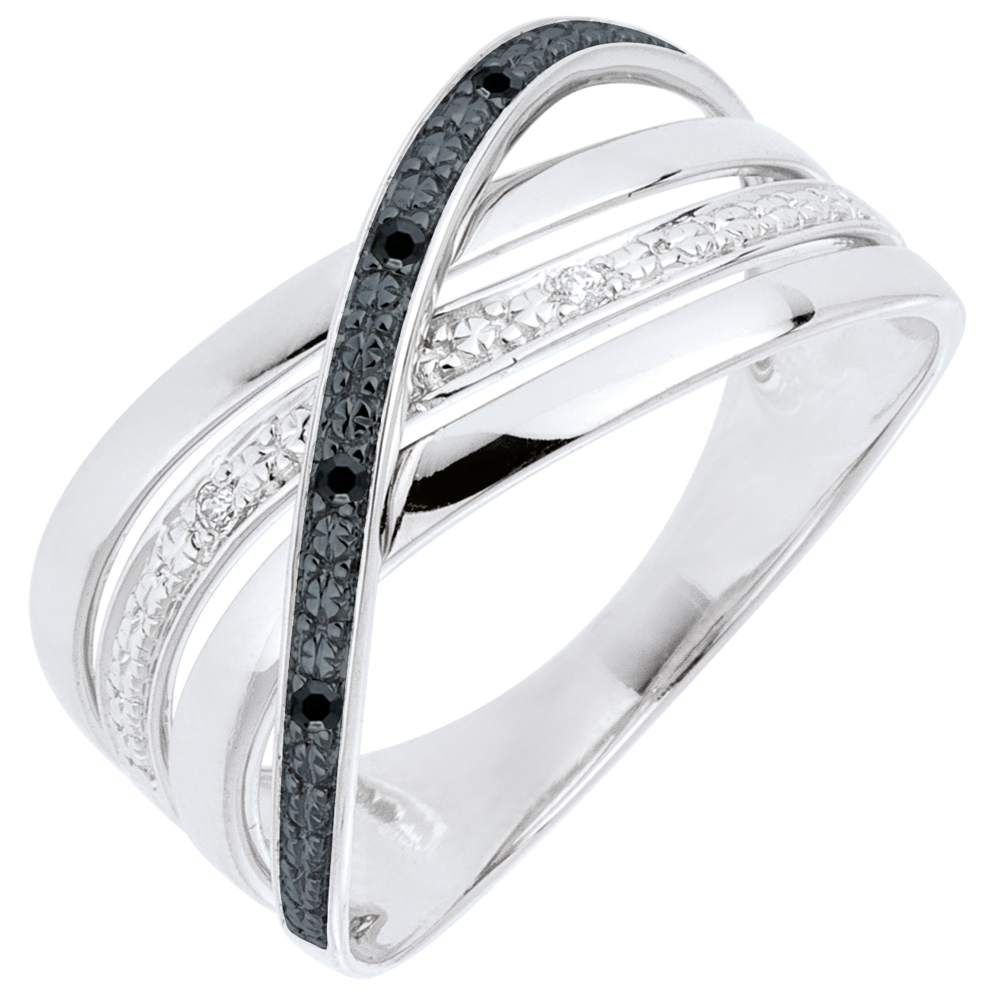 Een drievoudige witgouden band wordt doorkruist door een golf van diamanten.