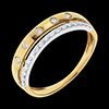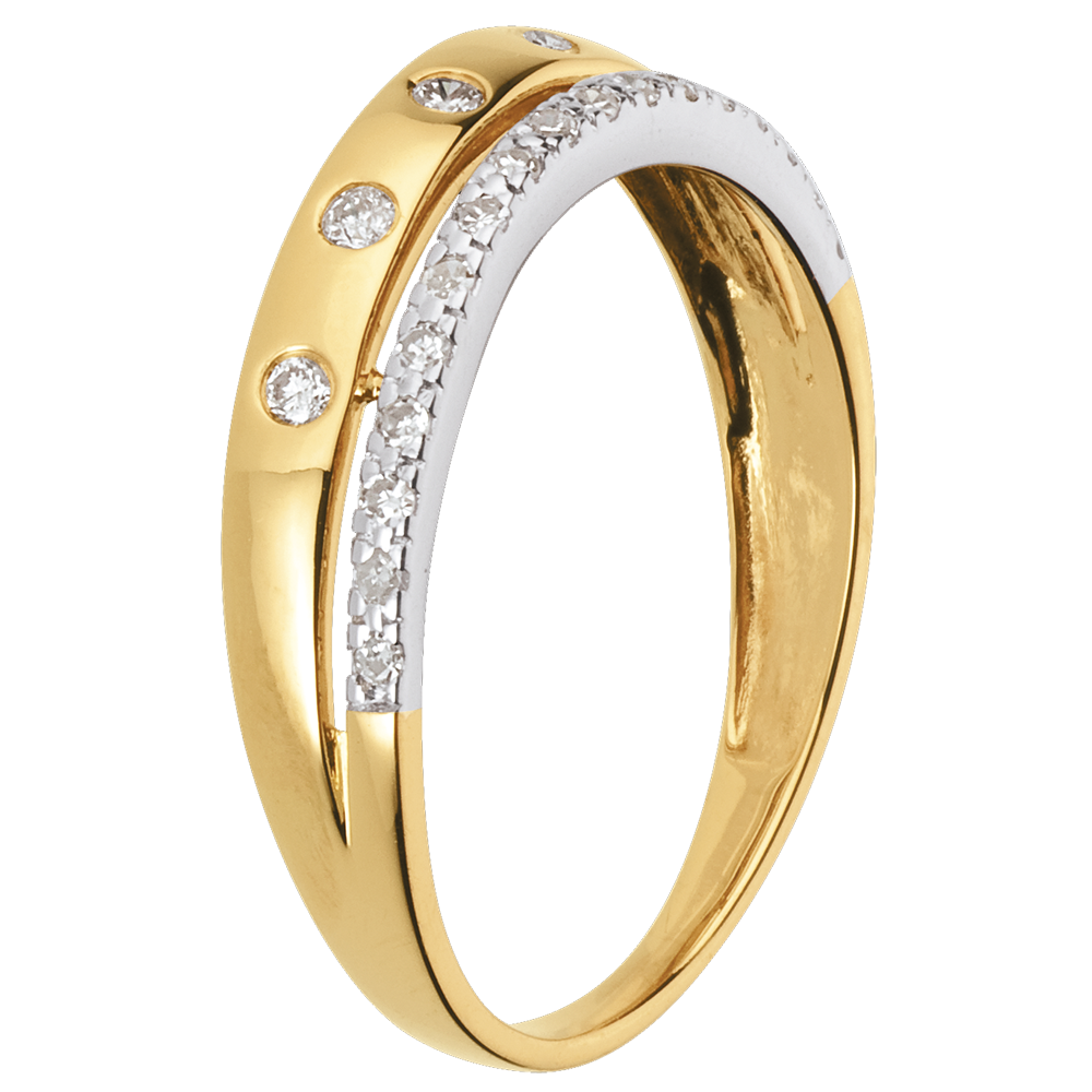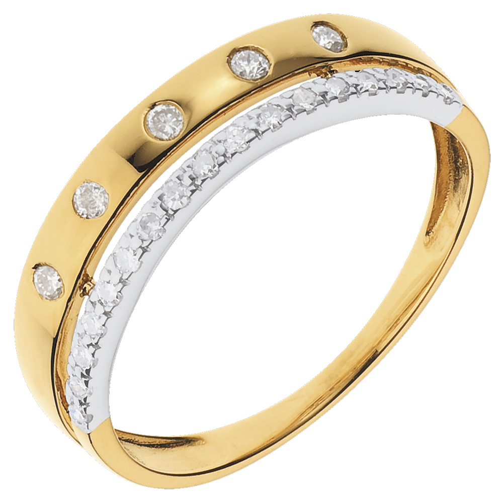 Een geelgouden trouwring met diamanten bezaaid als sterren is bekroond met een witgouden ring geplaveid met diamanten.