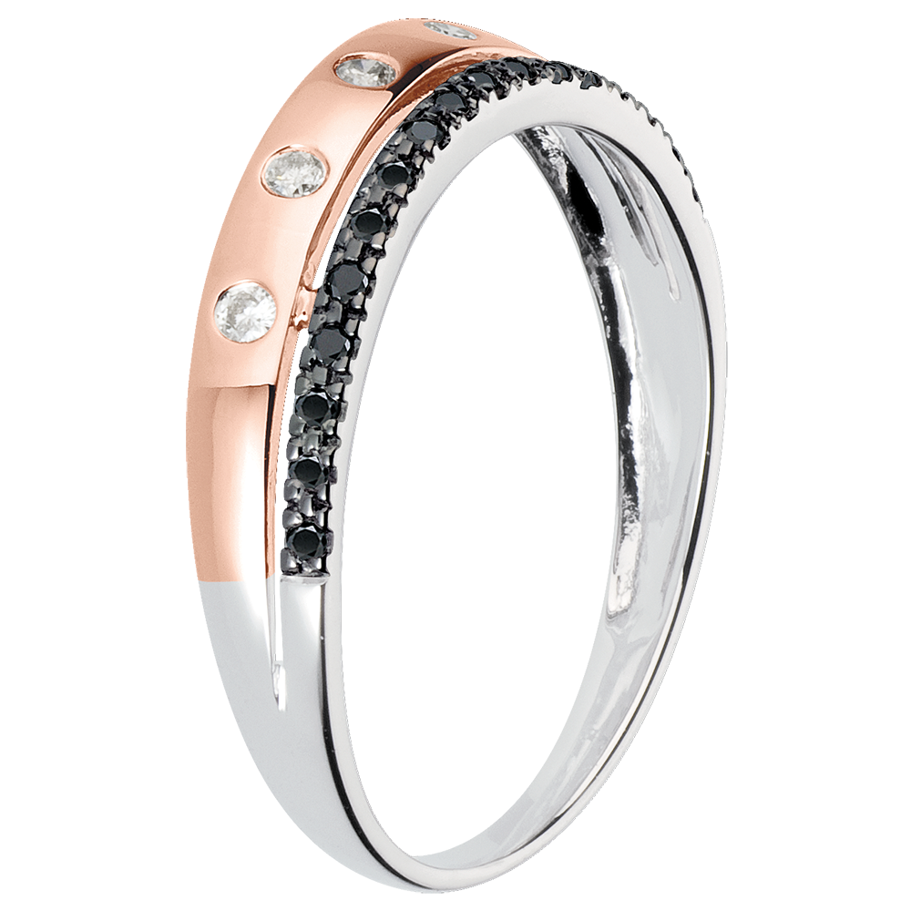Een roségouden trouwring met diamanten bezaaid als sterren is bekroond met een ring geplaveid met zwarte diamanten.