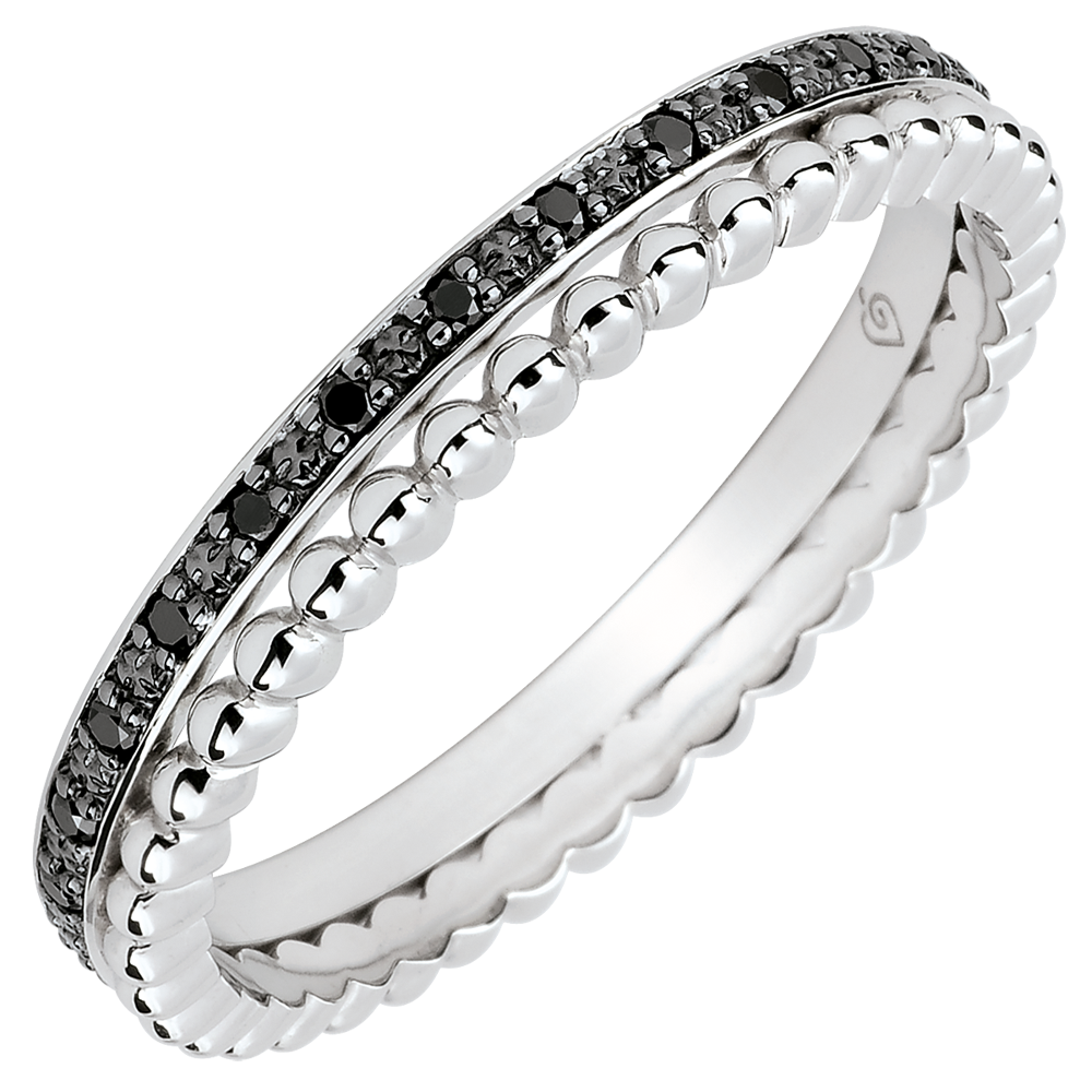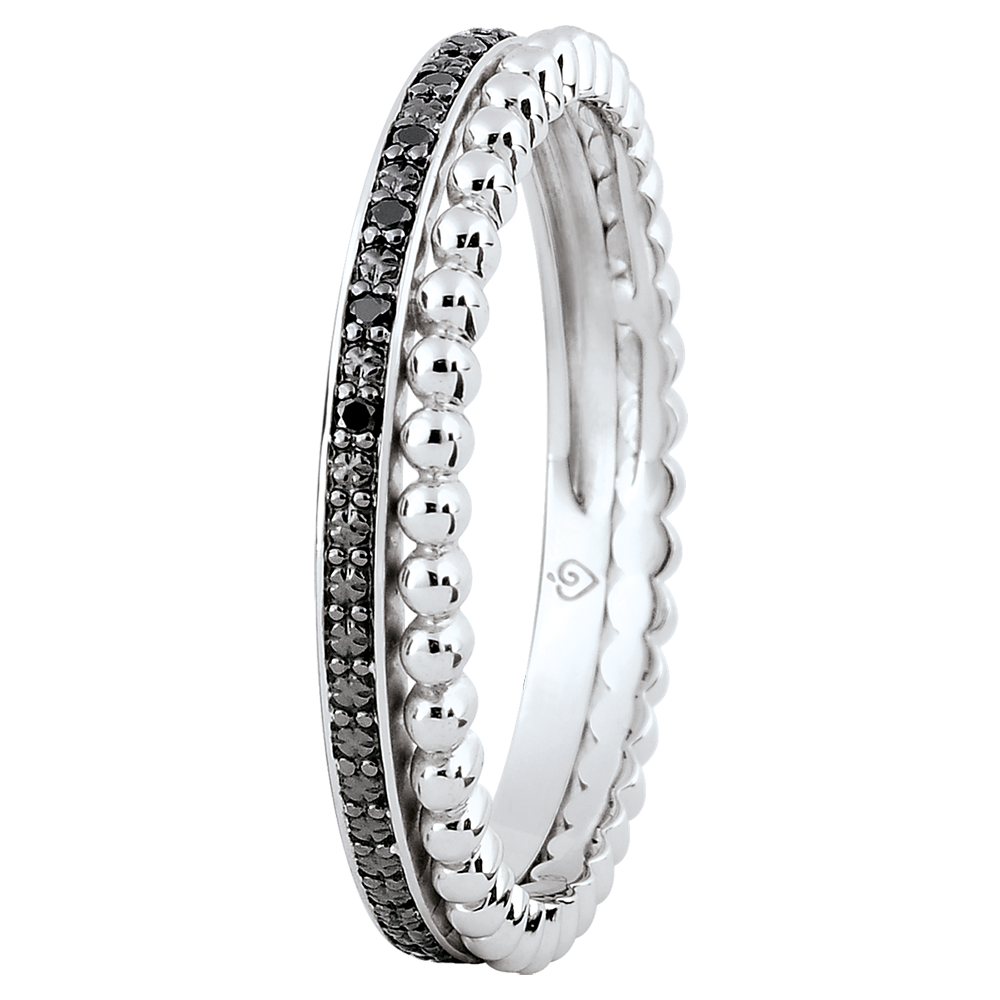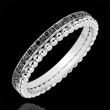 Een cirkel van witgoud bezet met zwarte diamanten vormt een delicaat duo met een cirkel van witgouden pareltjes. Een vrouwelijke trouwring, klassiek en origineel tegelijk.