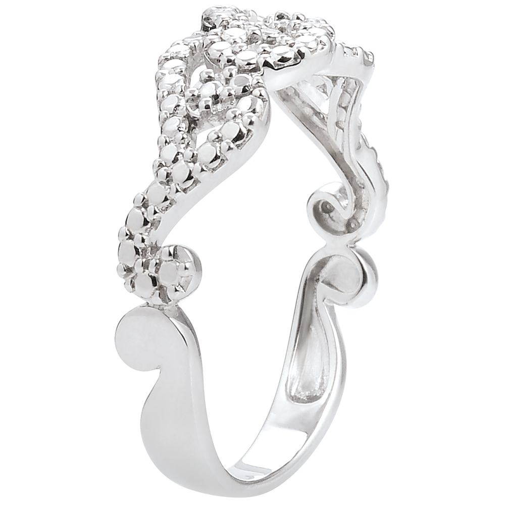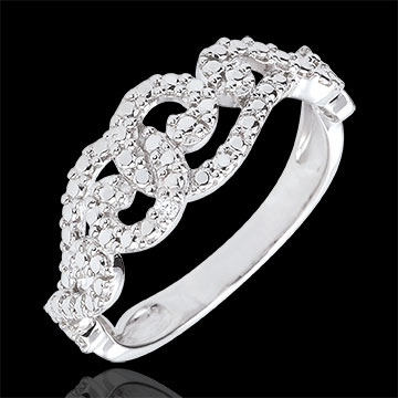 Verweven arabesken van witgoud en bezet met diamanten bieden deze ring originaliteit