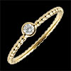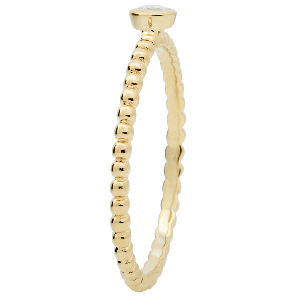 Een groot aantal gouden parels die een solitairee diamant begeleiden. Een moderne en vrouwelijke verlovingsring.
