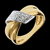 Een dubbele gouden ring verbonden met een witgouden lint en diamanten.