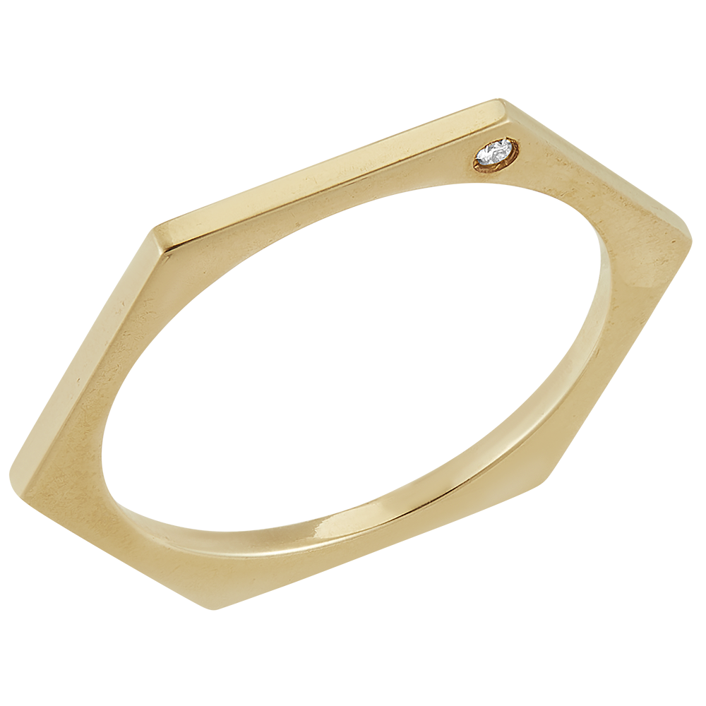 Deze minimalistische ring is geïnspireerd door de hexagonale vorm van honingraatcellen. De ring is vervaardigd in geelgoud en versierd met een enkele diamant gezet op de rand. Het strakke en moderne ontwerp maakt het een tijdloos juweel.