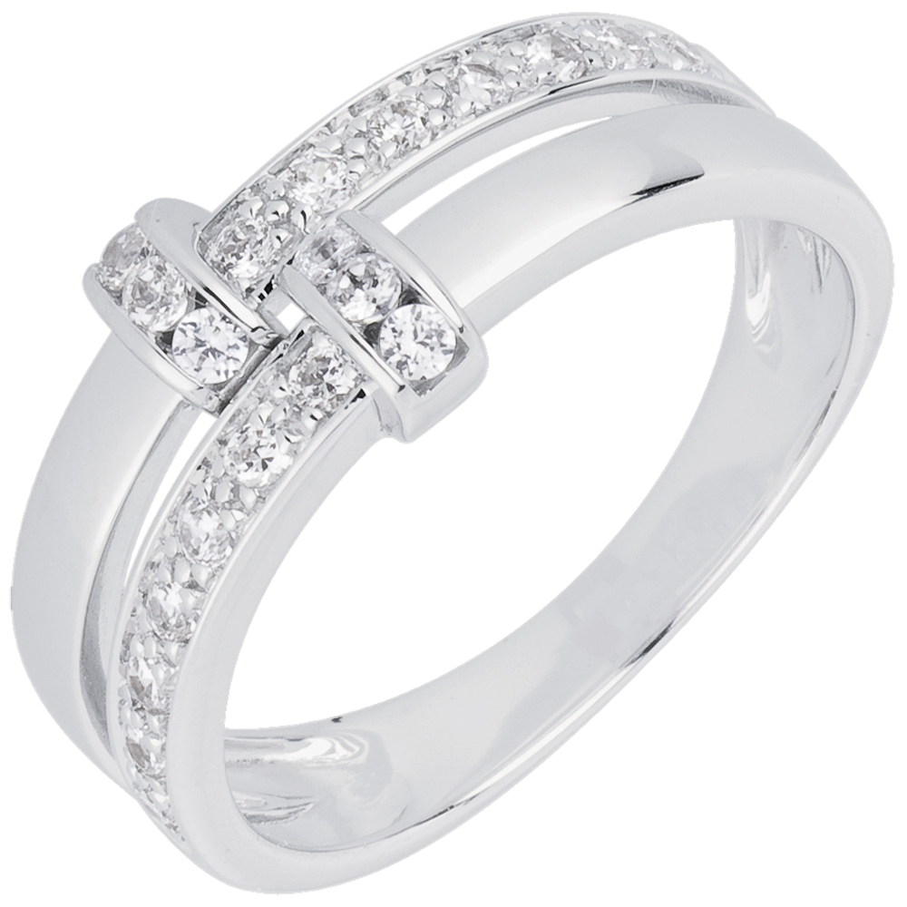 Twee witgouden ringen zijn verbonden door een betegelde witgouden link met briljanten.