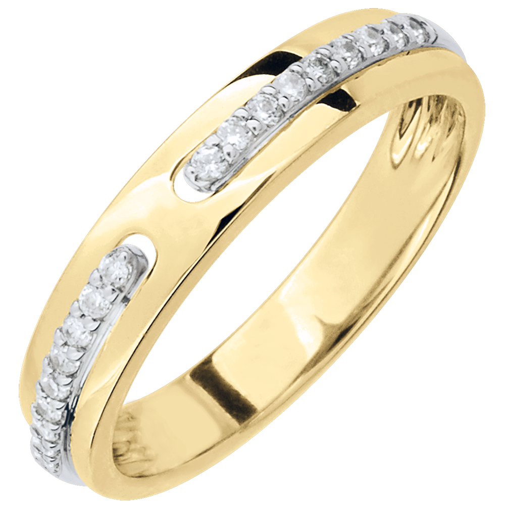 Twee rijen van diamanten worden verenigd als een belofte van de eeuwigheid in een gouden ring.