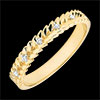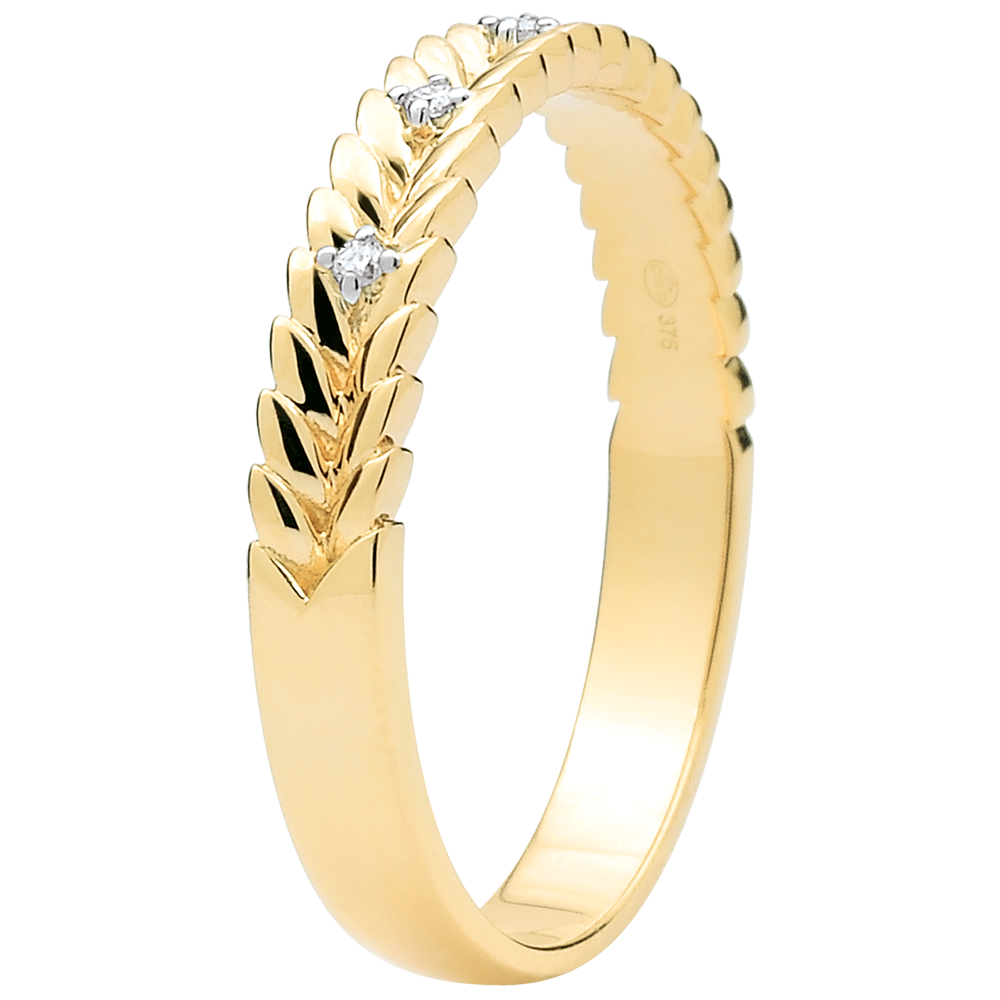 Fijne diamanten fonkelen als dauwdruppels op de blaadjes van gevlochten goud bij deze ring van geelgoud.