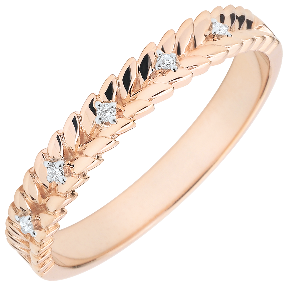 Fijne diamanten fonkelen als dauwdruppels op de blaadjes van gevlochten goud bij deze ring van roségoud.