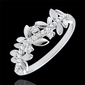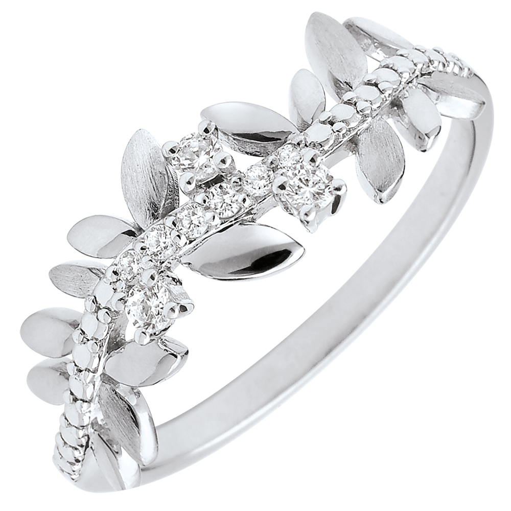 Afwisselend blad witgoud en schitterende geborstelde bladeren voor een romantische ring bezet met 9 diamanten.