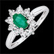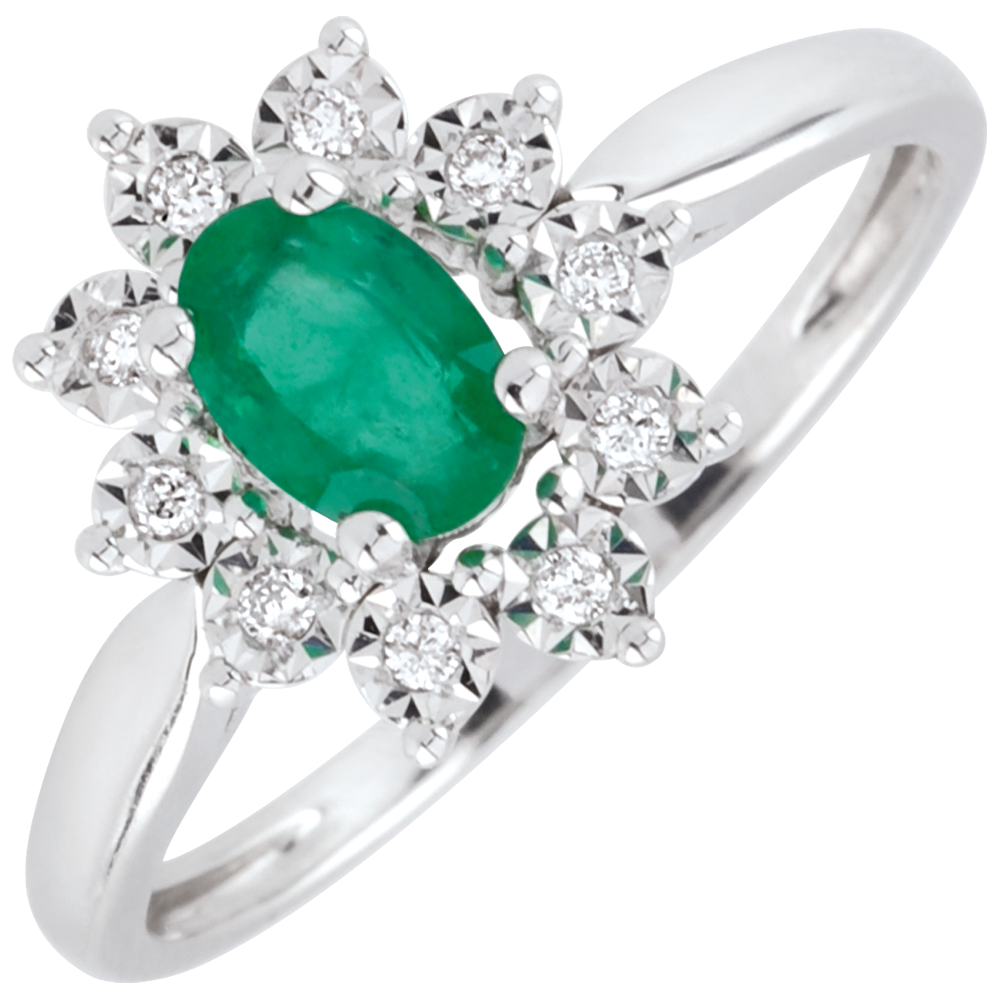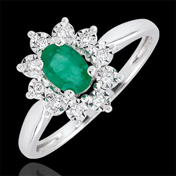 Een ovalen smaragd is het centrum van een witgouden madelief met bloemblaadjes ingelegd met een diamant.
