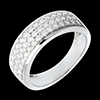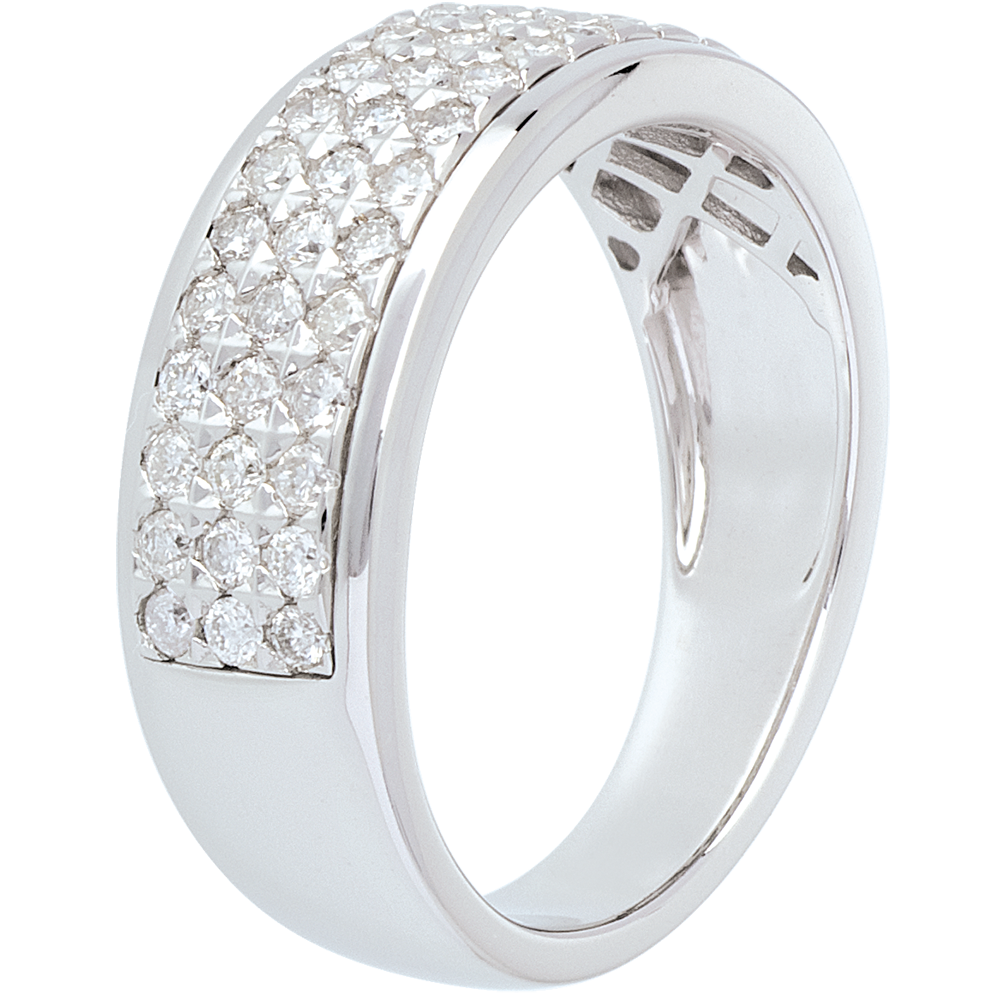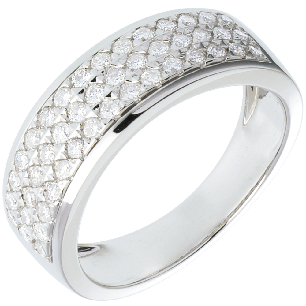 De iriserende schittering van een diamanten pavézetting geraffineerd en verzorgd, voor een uitzonderlijke ring.