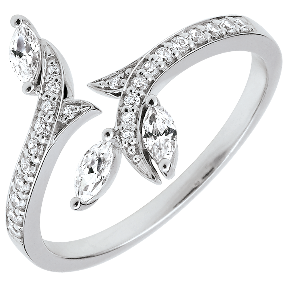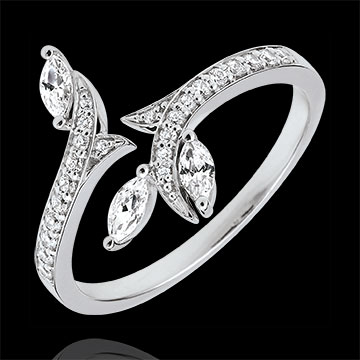 Een schitterende tak, tijdloos bevroren, is deze eeuwenoud of nieuw geboren? Zijn kostbare bladeren, zijn zaadjes in diamant, worden versterkt door het witgoud, bezet met de diamanten die hen omkaderen.